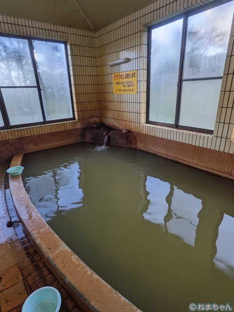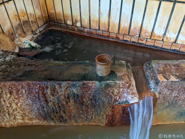 浴室は内風呂のみのシンプルなものですが、鉄分を含む炭酸水素塩泉で、茶色く濁ったお湯がかけ流されていて、飲用もできます。
